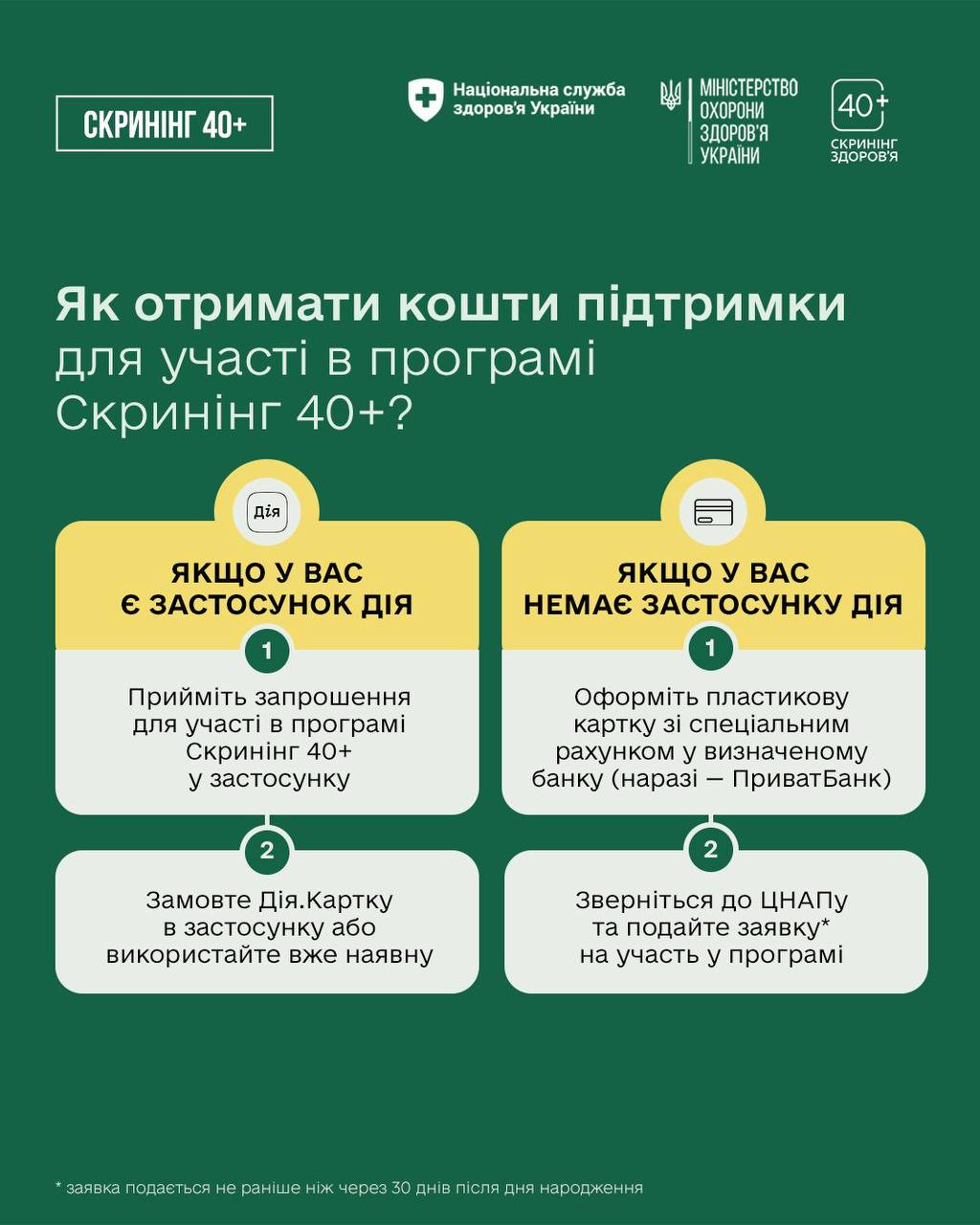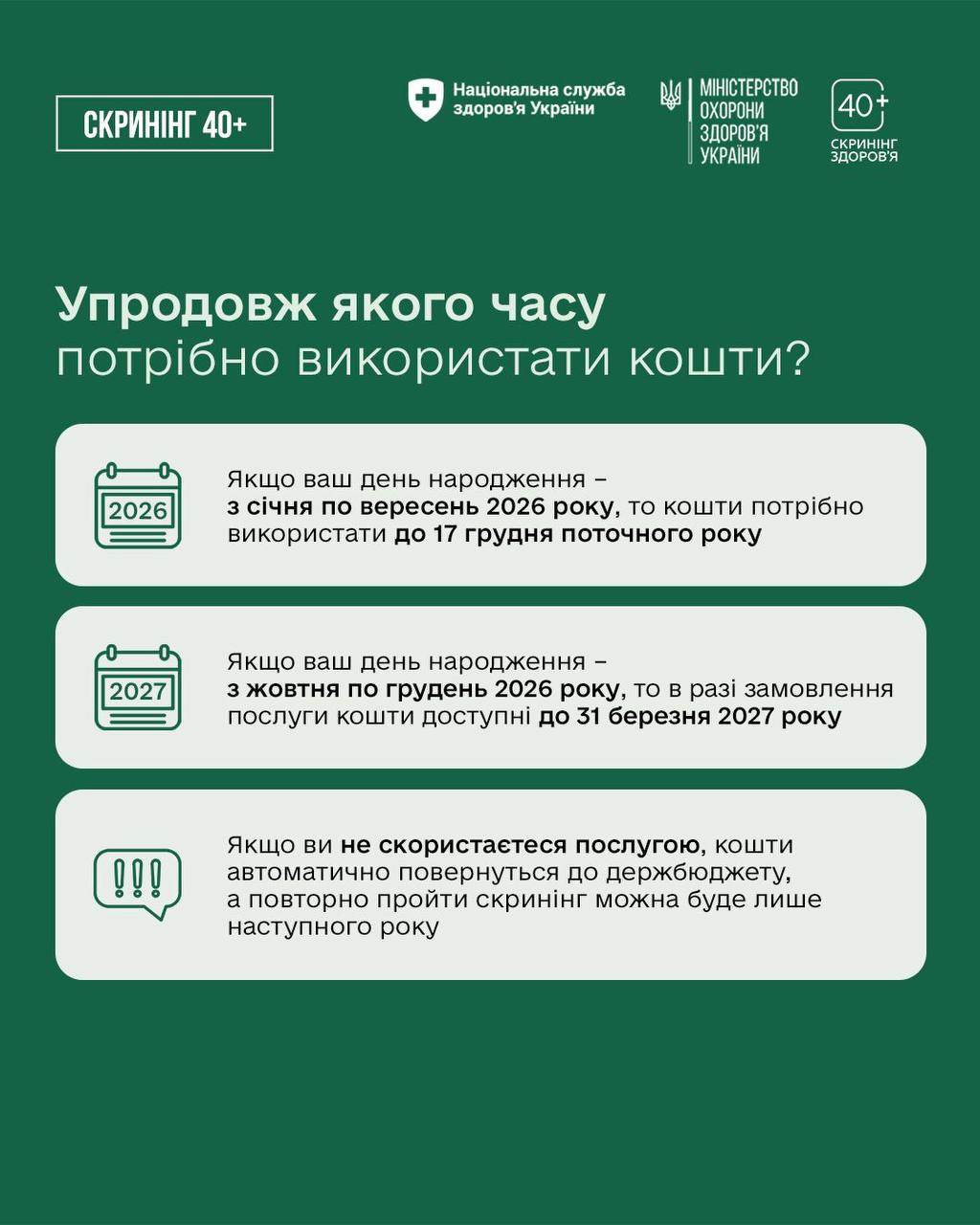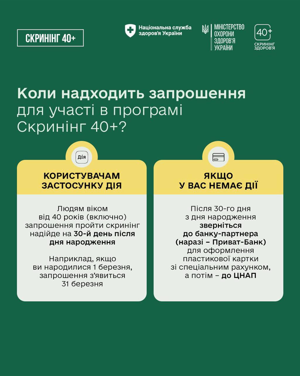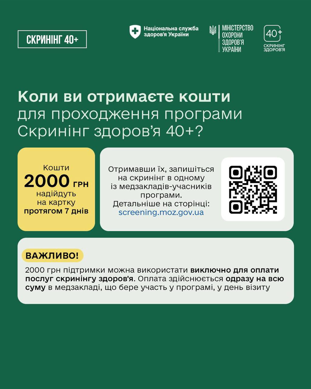 З 01 січня 2026 року як в Україні, так і в Полтавській області, стартувала Національна програма „Скринінг здоров’я 40+” , спрямована на раннє виявлення серцево-судинних захворювань, цукрового діабету і проблем психічного здоров’я для українців та українок віком від 40 років і старше.